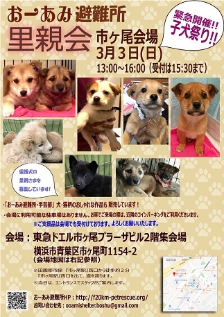 | イベント内容 | 仔犬だらけの里親会を特別開催します! 当日にはご来場できないかたも、ぜひお問い合わせください。 別日にお見合いの設定も可能ですが、仔犬の予約はお受けしておらず、 状況によりご希望の子が先に決まってしまう可能性があります。 その際は、残っている仔犬からのご紹介となりますのでご了承くださいませ。 どうぞ、よろしくお願いします。 ☆★☆★☆★☆★☆★☆★☆★☆★☆★☆★☆★☆★☆★☆★☆★☆★☆★☆★☆ ~3月3日(日)市ヶ尾にて里親会開催!~ ◎場所・・「東急ドエル市ヶ尾プラーザビル2階集会場」 横浜市青葉区市ヶ尾町1154-2 東急田園都市線「市ヶ尾」駅より徒歩2分 ◎日程・・3月3日(日)(雨天決行) ◎時間・・13時から16時(受付は15時30分まで) (駐車場はございません。お車でお越しの際は近隣のコインパーキングをご利用ください) ■当日ご来場の方全員にアンケートを記入して頂きます。 ■下記リンクより事前にアンケートをご記入いただくと、待ち時間が短縮されます。 ★ 犬ご希望のかた向けアンケート https://goo.gl/pwWUMj ■アンケートで頂戴した個人情報は適切に管理し、里親さま決定のための資料としてのみ使用いたします。 ■アンケートをご提出いただいても、譲渡をお約束するものではないことをご承知置きください。 ※参加予定の猫は体調により参加できない場合があります。ご了承ください。 ※詳細はお問い合わせいただくか、ブログ・HPをご覧くださいませ。 おーあみ避難所ブログ:http://ameblo.jp/oami-hinanjyo おーあみ避難所HP:http://www.geocities.jp/oami_hinanjyo/ ☆★☆★☆★☆★☆★☆★☆★☆★☆★☆★☆★☆★☆★☆★☆★☆★☆★☆★☆ |