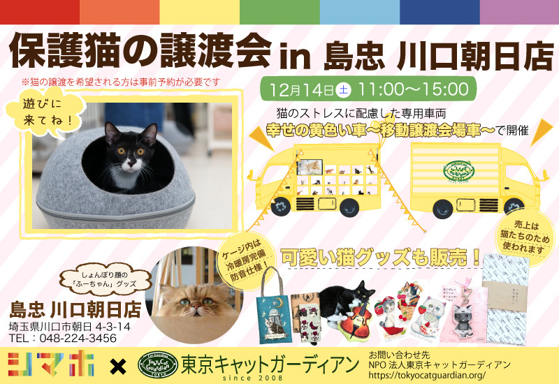 | イベント内容 | 幸せの黄色い車~移動譲渡会場車~in 島忠川口朝日店 幸せの黄色い車~移動譲渡会場車~が、島忠川口朝日店さんにやってきます! 猫のメンタルに配慮した、特別仕様の車です。 ケージ内は冷暖房完備・防音仕様の「幸せの黄色い車」の詳細についてはコチラ! https://tokyocatguardian.org/yellow_car/ 開催日は、twitterでも黄色い車で寛ぐ猫たちの写真を公開★ 猫たちに会いに来ていただけること 猫グッズ購入で支援してくださること 幸せの黄色い車を見に来ていただけること 全てがご支援になります。 お友達と、お誘い合わせの上ぜひよろしくお願いいたします! 会場では、可愛い猫グッズも販売します! しょんぼり顔のふわふわ猫、ふーちゃんのオリジナルグッズも限定発売★ 「子猫の家族になりたい」「可愛い猫グッズが欲しい」「遊びに行くことで支援したい」 という方は是非いらしてください! ★猫の里親になるには事前申し込みが必要です★ 申し込みはコチラ https://tokyocatguardian.org/cats_event/ 「幸せの黄色い車」の詳細についてはコチラ https://tokyocatguardian.org/yellow_car/ 【会場案内】 島忠 川口朝日 様 〒332-0001 埼玉県川口市朝日4-3-14 google map:https://goo.gl/maps/R848UPthnJL2 (アクセス) 【最寄り駅からの交通アクセス】 JR西川口駅 市立高校弥平行きバスにて 南4丁目下車 徒歩5分。 有明通り 前田東公園そば。南鳩ヶ谷駅下車徒歩5分。 【駐車場のご案内】 大型駐車場完備 料金:無料 |