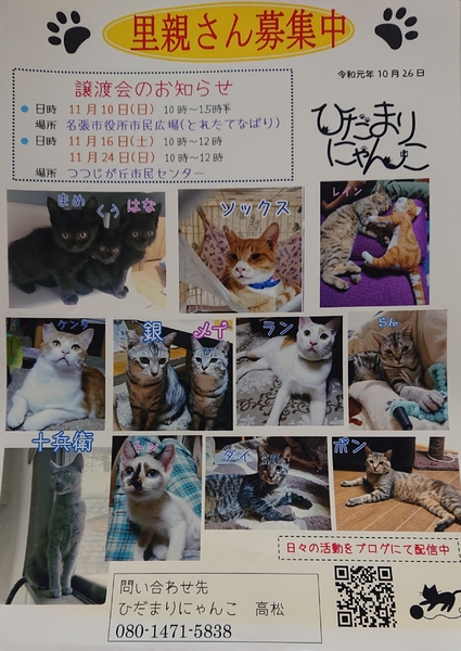 | イベント内容 | 保護猫の譲渡会です。 子猫から成猫さんまで可愛い子たちがたくさん来ます。 長い子で一年参加している子もいます。 成猫さんは性格ができているのでとても飼いやすいと思います。 ぜひぜひ、遊びに来てください。 お待ちしています。 この日は、たくさんのお店も並びすごく賑わいます。 イベントも盛りだくさんですので、可愛い猫ちゃんに癒され 美味しい物も食べ、いいものをたくさんゲットして帰ってくださいね 当会のブースでは、手作りの猫のおしゃれアイテムなども販売いたします。 詳細はこちらをご覧ください。 https://ameblo.jp/teruteru0214/entry-12542737766.html |