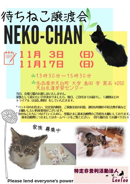 | イベント内容 | ♡待ちねこ♡譲渡会 子猫まつり!です 日時 2019年11月17日(日) 13:30~15:30 場所 天白生涯学習センター2階和室 名古屋市天白区 天白町島田 黒石4050 (天白公園内) 主催 NPO法人Leeloo 待ちねこ譲渡会 HP http://machineko.kilo.jp/ 当会が活動を行っている地域から保護をした猫たちが参加します。 健康診断、基本治療を済ませ、ワクチン接種を行った健康で元気な猫たちです。 予約不要 見学自由 当日、会場で猫のお渡しはいたしません。 家族として迎えたい子が決まりましたら、後日、ご自宅までお届けし、1週間ほどの トライアル(お試し飼育)をしていただきます。 * ペット可のお住まい、完全室内飼育、ご家族全員の同意、適切な時期の不妊去勢手術など お願いしたい約束事項がございます。 * 次のねこたちにつなげていくために、里親さまに基本治療費のご負担をお願いしております。 基本治療費につきましてはホームページをご覧ください。 ♡たくさんのねこたちが新しい家族を待っています。 ♡ねこたちとゆっくり触れ合ったり、抱っこしたりできます♪ ♡ぜひ可愛いねこたちに会いにいらしてください! |