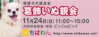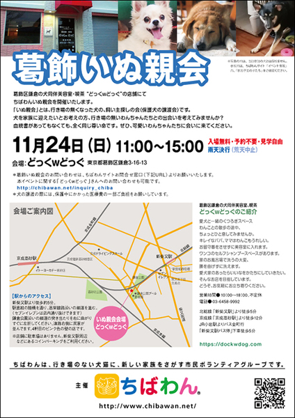 | イベント内容 | 葛飾区鎌倉のいぬ同伴美容室・喫茶“どっくwどっぐ”の店舗にていぬ親会を開催します。 可愛い保護わんこたちが新しい家族との出会いを求めて参加します!! いぬ親会見学は予約等必要ありません。 是非、ご家族同伴でご来場下さい。 開催日:11月24日(日)11:00~15:00 室内開催 雨天決行 場所:どっぐwどっぐ 東京都葛飾区鎌倉3-16-13 《アクセス》 どっくwどっぐ 【駅からのアクセス】 新柴又駅より徒歩約5分。 駅直結の陸橋を通り、高架線路沿いの細道を進みます。 (セブンイレブンは店内通り抜けできます) 鎌倉公園沿いの細道の突き当たりを右に曲がりすぐに左折してください。 道路右側に民家が並んでいます。4軒目のピンク色の壁の店です。 ※店舗に駐車場はありません。 当日お車の方はコインパーキングをご利用ください。 《注意事項》 【当日の流れ】 (1)家族募集中のいぬとお会いになりたい方はどなたでも自由にご参加いただくことができます。ちばわんボランティアは名札をつけておりますので、ご遠慮なくお声をかけて下さい。また、募集中のいぬのそばには預かりボランティアが控えておりますのでいぬの性格や生活習慣など、遠慮なくご質問ください。 (2)ご希望のいぬが決まったら、お申し込みアンケートにご記入の上、ボランティアにお渡し下さい(前日までにメールでアンケートを送信してお申し込みいただくこともできます。) ◆「いぬ」アンケート送信先:http://chibawan.net/contactform_dog (3)アンケート内容を拝見し、お話させていただきます。 (4)原則として一両日中にお返事の連絡をさせていただきます。 (5)ご縁が成立した場合には、後日、こちらからご自宅までいぬをお届けし、約1ヶ月のお試し生活に入っていただきます。お届けの際に、書面での譲渡契約書を交わします。 ※ワクチン・不妊手術代など保護犬にかかった費用は、家族になるいぬ親さんにもご負担をお願いしています 《お知らせ》 会場ではチャリティグッズを販売します 売上金は保護した犬猫の医療費など、 ちばわん活動費として大切に使わせていただきます 《お問い合わせ》 いぬ親会について:http://chibawan.net/inquiry_dog_other ※いぬ親会当日はメールが見られません。また、お問い合わせの際は、必ず「具体的な件名」を入れて多数の迷惑メールと区別がつくようにお願いいたします。 葛飾いぬ親会イベントホームページ https://chibawan.net/event/20191124-katsushika-dog ちばわんホームページ http://chibawan.net/ |