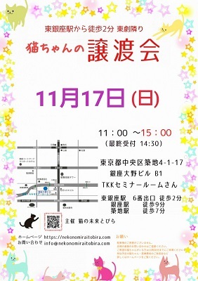 | イベント内容 | 東銀座で保護猫の譲渡会を開催しています「猫の未来とびら」です♪ 恵まれない環境にいる猫たちが未来へのとびらを開いて幸せなご縁に繋がる橋渡しをしていきます。 たくさんの猫ちゃんと保護主・スタッフ一同みなさまのご来場を心よりお待ちしています! 子猫ちゃん〜成猫ちゃんまで参加します♪ ★開催日時 2019年11月17日(日) 11:00~15:00 (最終受付 14:30) ★会場 東京都中央区築地4-1-17 銀座大野ビル B1 TKKセミナールームさんにて (東劇となり) ★最寄駅 東銀座駅 6番出口 徒歩2分 銀座駅 徒歩9分 ・築地駅 徒歩7分 駐車場のご用意はございませんので近隣のコインパーキング等をご利用ください。 会場への直接のお問い合わせはご遠慮くださいませ。 ★☆★★☆★★☆★★☆★★☆★★☆★★☆★★☆★★☆★ 会場で猫ちゃんと触れ合ってご縁を繋いでください。 里親様・猫ちゃんが双方、幸せな家族になれるよう保護主・スタッフがサポート致します。 ご不安な事はお気軽にご相談ください。 入場無料です。事前のご予約は必要ございません。 ご希望の猫ちゃんがいらっしゃる里親希望者様は11時~11時30分までに会場へお越しください。 11時30分までに受付されたすべての里親希望者様と保護主がお話をさせて頂き 1匹に複数のお申込み、里親様と猫ちゃんに合うご家庭がございましたら 受付を終了する場合もございます。 里親様が決まっていない猫ちゃんに関しましては随時保護主とご相談ください。 当日猫ちゃんの引き渡しはございません。 後日、保護主が里親様宅へお届けいたします。 ※参加予定猫ちゃんは、急な体調不良等で不参加になる場合もございます。 開催当日の朝、当会ブログにて不参加の最新情報を掲載致しますのでご確認をお願い申し上げます。 ◇譲渡に関してのお願い・基本条件 1.家族の一員として終生最期まで愛育下さい。 2.完全室内飼い・ペット可のお住まい 3.脱走防止対策 4.避妊・去勢手術 5.里親様のご自宅へのお届け 6.譲渡誓約書への署名捺印・身分証明書の提示 7.医療費譲渡金のご負担 8.定期報告 9.トライアル期間有り ※保護主により譲渡条件は異なりますので会場で直接ご相談ください。 60才以上の方のみのご家庭、未成年の方、単身の方、 必要な脱走対策を施していただけない方は譲渡が難しい場合もございますのでご了承ください。 小さな子猫の譲渡は体重が1kgになってからのお届けやお留守番の無い(少ない)ご家庭を希望いたします。 医療費譲渡金に関しましては詳しくはホームページの 【譲渡に関してのお願い】【譲渡の流れ】をご覧くださいませ。 〜主催 猫の未来とびら〜 |