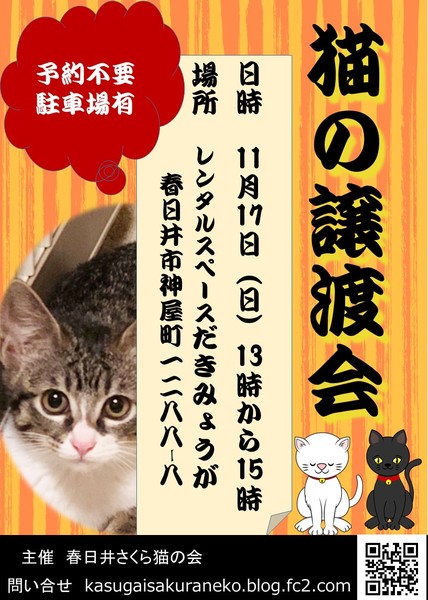 | イベント内容 | 20匹程の子猫から中猫、成猫が参加します。 お隣はアットホームな素敵なカフェです。素敵な出会いとリラックス気分をお楽しみください。 参加猫は春日井さくら猫の会のブログで紹介しています。 kasugaisakuraneko.blog.fc2.com |