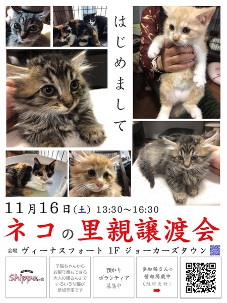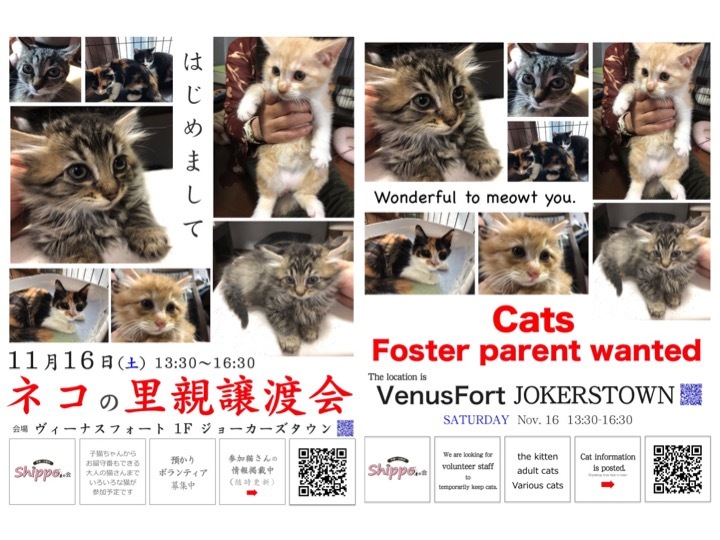 | イベント内容 | 11月16日(土)ヴィーナスフォートで里親譲渡会を開催致します。 13時30分スタートです! 参加猫さんはこちらからご覧下さい。(随時更新) ↓ https://www.pet-home.jp/member/user360938/post/ 子猫ちゃんたちも参加予定なので、小さい頃から一緒に暮らしたい、育てたいとお考えの方、ぜひお越しください! 一人暮らしの方やご高齢の方にもぴったりの、まったりした大人猫さんたちも参加予定です。 参加できない猫さんたちも、会場内で紹介予定です。 きっと、運命の出会いがあると思います。 里親希望の皆さま、ぜひ、足をお運びください! ●日時:11月16日(土) 13:30~16:30 ●会場:ヴィーナスフォート 1Fジョーカーズタウン内(ペットと暮らそう) 東京都江東区青海1-3-15 下記店内マップをご参照ください。 https://www.venusfort.co.jp/floormap/1f.html ●アクセス ゆりかもめ「青海駅」徒歩6分 りんかい線「東京テレポート駅」徒歩10分 ●参加猫および諸条件については、下記「ペットのおうち」からご覧ください。(随時更新) https://www.pet-home.jp/member/user360938/post/ ☆譲渡には当会における一定の条件があります。 ☆当会および里親譲渡会についてのお問い合わせ ☆外猫、保護猫のために物資のご支援を頂ける方がおりましたら、送付先をご連絡させていただきますのでご連絡下さい。 ☆預かりボランティアさん、活動のお手伝いをして頂ける方も随時募集中です。 hilakoma@yahoo.co.jp |