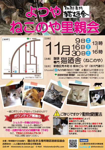 | イベント内容 | FIPフリー:全頭FIP血液検査を実施。陽性の子と陰性の子は隔離、猫たちは最高の環境の中にいます。 コロナウィルス抗体価100未満陰性の子のみ里親会に参加。 また、お問い合せの前にお願い事項の確認をお願いします。 http://homepage2.nifty.com/hitotoneko/keiyaku.html 4箇月齢以下の子猫は、 2頭一組または同世代の先住子猫がいる方、 お留守番時間が8時間以下の方 に限ってお譲りします。 成猫については、お留守番時間についての制限は特にございません。 猫又は犬を4頭以上飼っている方にはお譲りできません。 55歳以上の方には、子猫はお譲り出来ません。 60歳の方は5歳、65歳の方なら10歳の成猫ならお譲りできます。 お試し期間は1週間です。 お申し込み時に、運転免許証、健康保険証など、 身分を保証する証明証の提示をお願いします。 猫が欲しい。猫を飼ってみたい。 猫に不妊・去勢手術を受けさせたい。 猫のボランティアをやってみたい その他、猫の相談よろず引き受けます。 一緒にボランティアをやってみませんか。会員募集中! 港区、新宿区のシェルターの猫のお世話係 週1回、2時間程度、時間帯は自由 学生には交通費として1000円を一律に支給します。 他に、TNRボランティア、搬送ボランティアなどを募集しています。 まずはお気軽に体験作業にお越し下さい。 主催 地域猫から社会猫へ・猫の生きる権利確認連絡協議会 電話 080-5437-2665 メールアドレス hitotoneko@ezweb.ne.jp ホームページ http://hitotoneko.la.coocan.jp |