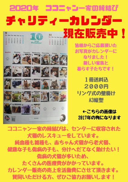 | イベント内容 | ココニャン一家の縁結びは千葉市動物保護指導センターに収容された 犬猫のレスキューを行なっております。 乳飲み子からシニア、純血種も雑種も、小型から大きな子も、健康な子も傷病の子も、 「命の選択はせず、全員助ける気持ち」で活動をしています。 交通事故や傷病の子などが頻繁に収容されて、医療費がとてもかさんでいます。 チャリティーカレンダーを販売し、収益を活動費(ほぼ医療費です)に充てております。 17日までが販売期限になります。ぜひご協力をお願いいたします。 A3サイズです。幸せになった子達のお写真があふれています。 販売サイトはこちら★http://coconyangoods.cart.fc2.com/ca2/108/p-r-s/ 24時間ネットで販売しております。 HP★http://coconyanikkanoenmusubi.web.fc2.com/ ブログ★https://ameblo.jp/coconyanikkanoenmusubi/ |
