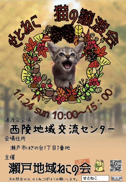 | イベント内容 | 猫の譲渡会を開催します★ 子猫から大人猫まで、いろんな柄の可愛い子達が参加します。 ぜひ遊びに来てくださいね! |