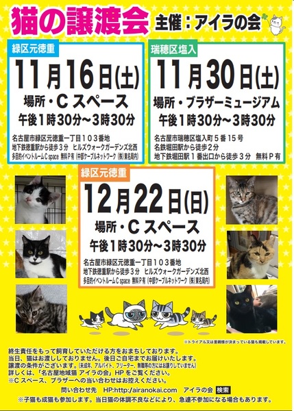 | イベント内容 | 11/30(土) 場所 ブラザーミュージアム 会議室 住所 名古屋市瑞穂区塩入町5-15 開催時間 13:30~15:30まで 無料P有り ☆名鉄堀田駅から徒歩2分、地下鉄堀田駅1番出口から徒歩3分 予約不要ですが、 ご来場前に必ず譲渡の約束事を「踊るココちゃんブログ」でご確認ください。 http://airanokai.blog.fc2.com/ 参加猫もこちらのブログに準備で来次第掲載してゆきます。 主催:名古屋地域ネコ アイラの会 http://airanokai.com/ ※当日ご都合が悪い場合、別途お見合いも致します。 問い合わせ先 airanokai$gmail.com $を@に変えて送ってください。 http://airanokai.com/ でご覧ください。 当日ネコをお渡しすることはしていません。 飼育環境を見届けさせていただくため、後日ご自宅までお届けします。 譲渡誓約書を取り交わします。詳細はHPをご覧ください。 なお、お一人暮らしの高齢者の方は、身内の方の保証を必要とします。 ペット不可物件にお住まいの方、学生、フリーター、同棲カップル、無職の方への譲渡はお断りしています。 予めご了承ください。 ☆譲渡会では、アンケートのご記入をお願いしています。 アンケート内容をもとにお話をすすめさせていただきます。 猫を迎えることに関し、ご家族の了解を得ており、家族の一員として責任を 持って迎えていただける方にのみ譲渡させていただきます。 |