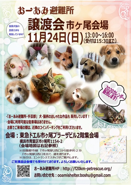 | イベント内容 | 可愛い仔犬・仔猫・成猫がたくさん、出場しますよ! 当日にはご来場できないかたも、ぜひお問い合わせください。 別日にお見合いの設定も可能です。 どうぞ、よろしくお願いします。 ☆★☆★☆★☆★☆★☆★☆★☆★☆★☆★☆★☆★☆★☆★☆★☆★☆★☆★☆ ~11月24日(日)市ヶ尾にて里親会開催!~ ◎場所・・「東急ドエル市ヶ尾プラーザビル2階集会場」 横浜市青葉区市ヶ尾町1154-2 東急田園都市線「市ヶ尾」駅より徒歩2分 ◎日程・・11月24日(日)(雨天決行) ◎時間・・13時から16時(受付は15時30分まで) (駐車場はございません。お車でお越しの際は近隣のコインパーキングをご利用ください) ■当日ご来場の方全員にアンケートを記入して頂きます。 ■下記リンクより事前にアンケートをご記入いただくと、待ち時間が短縮されます。 ★ 猫ご希望のかた向けアンケート https://goo.gl/ZNRFtI ★ 犬ご希望のかた向けアンケート https://goo.gl/pwWUMj ■アンケートで頂戴した個人情報は適切に管理し、里親さま決定のための資料としてのみ使用いたします。 ■アンケートをご提出いただいても、譲渡をお約束するものではないことをご承知置きください。 ※参加予定の猫は体調により参加できない場合があります。ご了承ください。 ※詳細はお問い合わせいただくか、ブログ・HPをご覧くださいませ。 おーあみ避難所ブログ:http://ameblo.jp/oami-hinanjyo おーあみ避難所HP:http://www.geocities.jp/oami_hinanjyo/ ☆★☆★☆★☆★☆★☆★☆★☆★☆★☆★☆★☆★☆★☆★☆★☆★☆★☆★☆ |