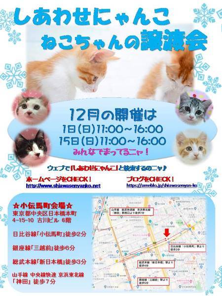 | イベント内容 | 「しあわせにゃんこ」は行き場のない猫ちゃんと里親様との出会いの場を提供するグループです♪ 子猫も成猫もハンデのある猫もみんな新しい家族を待っています♪ みなさまのご来場を保護主、スタッフ一同心よりお待ちしております♪ ◆開催日/開催時間◆ 2019年12月1日(日) 11:00~16:00 ご希望の猫ちゃんがいらっしゃる場合は11時30分までに受付をお願い致します。 複数のお申し込みがある場合は11時30分で受付を終了させて頂く場合がございます。 受付をされた全ての里親様とお見合いをさせて頂きます。 ※先着順ではございません ※当日、猫ちゃんを連れて帰ることは出来ません。後日、保護主が里親様宅へお届けいたします。 ◆会場◆ 東京都中央区日本橋本町4-15-10 古川ビル 6階 ※エレベーターでお上がり下さい。 ※詳しいアクセスはHPをご覧下さい http://www.shiawasenyanko.net/jyoutokai.html ◆交通手段◆ 日比谷線「小伝馬町」駅より徒歩2分 銀座線「三越前」駅より徒歩6分 JR総武本線「新日本橋」駅より徒歩3分 JR山手線:中央線快速:京浜東北線「神田」駅より徒歩7分 都営新宿線「岩本町」「馬喰横山」駅より徒歩7分 ※お車でご来場の際、駐車場のご用意はございません。 近隣のコインパーキング等をご利用ください。※近隣に沢山あります。 いつ里の掲載参加猫一覧はこちらから https://satoya-boshu.net/mypage/foster_list.php?@ps@=none アメーバブログの里親募集にゃんこはこちら https://ameblo.jp/shiawasenyan-ko/theme-10092719565.html ◆猫ちゃんとのお見合い◆ 掲載している猫ちゃんは基本的に譲渡会場でのお見合いのみとなります。 譲渡会への参加が決定している猫ちゃんはその譲渡会で里親様が決定しなかった場合のみ保護主宅でのお見合いが可能となります。 自宅お見合いを希望される里親様はメール(info@shiawasenyanko.net)にてご相談ください。 ◆当譲渡会では猫ちゃんと里親様のスキンシップを大切にしています◆ 新しい家族として20年以上いっしょに暮らしていく猫ちゃんです。 譲渡会場でたくさんの猫ちゃんと触れ合って良きパートナーを見つけてください。 はじめて猫ちゃんを迎える不安や先住猫ちゃんとのトライアルの注意点、猫ちゃんと里親様の暮らし方など気軽にご相談ください。 経験豊富な保護主や猫大好きスタッフがアドバイスさせていただきます。 ◆子猫ご希望の里親様◆ 子猫は急な下痢や発熱等により体調が急変し、数時間対応ができなかっただけでも命を落とす事があります。 その為、当譲渡会では月齢によりお留守番のない又は少ないご家庭への譲渡に限らせて頂いております。 また里親様と子猫ちゃんが安心してトライアル期間を過ごせるよう体重が1㎏程になってからのお届けとさせて頂いております。 ◆里親希望のみなさまへ◆ ご家族の皆様で生涯、家族の一員としてたっぷり愛情を注いでくださるご家庭をお待ちしております。 恐れ入りますが ・独身、単身者の方 ・友人同士、同棲でのお住まいの方 ・高齢者のみのご家庭の方 ・脱走防止対策にご協力頂けない方 はご希望に添えない場合もございますのでご了承下さい。 ※詳しくはその他連絡事項をお読みください。 ◆ご負担頂く費用について◆ 譲渡の際に譲渡負担金(医療費の一部、譲渡金、お届け時の交通費)を里親様にご負担頂く事により 過酷な状況にいる猫ちゃんを保護し新しいご家族の元へ送り出す事ができています。 皆様のご理解とご協力にボランティア一同、心より感謝しております。 ご負担頂く医療費につきましてはホームページに詳しく記載させて頂いております。 http://www.shiawasenyanko.net/onegai.html しあわせにゃんこホームページ http://www.shiawasenyanko.net メールでのお問い合わせ info@shiawasenyanko.net |