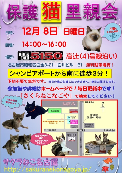 | イベント内容 | 子猫中心の里親会を開催します。 たくさんの保護猫が参加予定です。 予約不要で無料です。無料駐車場あります。 初めて猫を飼われる方もできる限りのサポートをさせていただきます。 参加猫や詳細はホームページでご確認ください! http://sakuranekonagoya.jp/ |