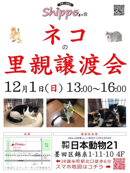 | イベント内容 | 今回も錦糸町の専門学校日本動物21様のご協力により、同校舎で猫の里親譲渡会を開催させていただくことになりました。 13時00分スタートです! ヤンチャな子猫・おとなしい子猫・お留守番バッチリの大人猫さんたちが参加予定です。 一緒に保護した兄弟猫さん、一生懸命子育てしたママ猫さん、ハンディでも元気な猫さん等々、個性豊かな猫さんたちが準備万端で、里親さんとのご縁を待っています。 参加猫さんはこちらからご覧下さい。(随時更新) https://www.pet-home.jp/member/user360938/post/ https://www.pet-home.jp/member/user574503/post/ 小さい頃から一緒に暮らしたい育てたいとお考えの方、子猫ちゃんたちも参加予定なので、ぜひお越しください! 一人暮らしの方やご高齢の方にも、ぴったりのまったりした大人猫さんたちも参加予定です。 きっと、運命の出会いがあると思います。 里親希望の皆さま、ぜひ、足をお運びください! ●日時:12月1日(日) 13:00~16:00 ●会場:専門学校 日本動物21 墨田区錦糸1-11-10 4F https://goo.gl/maps/ERRD2brtQEvvuxYs9 ●アクセス: JR総武線・総武快速線「錦糸町駅」 北口徒歩6分 東京メトロ半蔵門線「錦糸町駅」 3出口徒歩6分 ※東京都墨田区錦糸1-2-1(アルカタワーズ)は同校の法人本部です。 里親譲渡会の会場ではございませんので、お間違いのないよう御願い致します。 ●参加猫および諸条件については、下記「ペットのおうち」からご覧ください。(随時更新) https://www.pet-home.jp/member/user360938/post/ https://www.pet-home.jp/member/user574503/post/ ☆譲渡には当会における一定の条件があります。 ☆当会および里親譲渡会についてのお問い合わせ ☆外猫、保護猫のために物資のご支援を頂ける方がおりましたら、送付先をご連絡させていただきますのでご連絡下さい。 ☆預かりボランティアさん、活動のお手伝いをして頂ける方も随時募集中です。 (お問合せは、↓アメブロの「お問合せ」から) アメブロ、更新中です? https://ameblo.jp/hirakomashippo/ インスタグラム、更新中です? https://www.instagram.com/hirakomashippo/ |