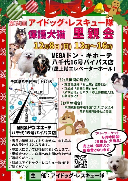 | イベント内容 | 第64回八千代里親会&フリーマーケット同時開催!! 日時:12月8日(日)13時~16時 会場:『MEGAドン・キホーテ』八千代16号バイパス店 屋上階エレベーターホール (千葉県八千代市村上1245) 《車》 東関東自動車道 千葉北インター出口 約15分 無料駐車場完備(650台) 《電車・バス》 東葉高速線「村上駅」より徒歩12分 もしくは 京成線「勝田台駅」南口より「米本団地」行きバス乗車「郷土博物館入口」下車、徒歩6分 ※当日の参加犬については、追ってご紹介します。 ※会場内でフリマ同時開催いたしますので、どうぞお出でくださいませ! ◆参加犬の詳細はホームページを御覧下さい。 http://aidog.jpn.com 皆様のお越しを心よりお待ちしております。 |