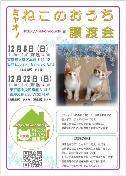 | イベント内容 | 参加する保護猫ちゃんについては、譲渡会一週間前からホームページhttp://nekonoouchi.jp/にてご紹介しております。 事前予約はできません。譲渡会場でお会いしましょう。 ※お問い合わせはホームページ内の【お問い合わせ】からお願い致します。保護主は日々、猫ちゃんのお世話と仕事に忙しくしておりますので、お返事に数日頂くこともございます。ご了承ください。 譲渡会場では、入口で簡単なアンケートにお答えいただきます。 気になる猫ちゃんがいたらスタッフにお声がけください。 面談後、双方に不安がないようでしたら、トライアル開始日をご相談させていただきます。 譲渡会当日に猫ちゃんを連れて帰ることはできません。 トライアル開始日にご自宅にお届けします。 トライアル期間を経て問題がないようでしたら、譲渡成立となります。 詳細は、ホームページ【譲渡の流れ】ページでご確認いただけます。 ◇譲渡に関するお願い 【ミャオ!ねこのおうち譲渡会】では、以下のお約束をお願いしております。 ・完全室内飼いで終生愛育 ・脱走させないための対策 ・不妊去勢手術 ・譲渡誓約書の取り交わし ・医療費の一部ご負担 ・記念の写真撮影 ・原則として、譲渡時に60歳未満の方 その他、ひとり住まいで緊急時の対応に困難な方や、経済的に困難な世帯、必要な脱走対策を施していただけない場合はご遠慮頂いております。 また、保護主により譲渡条件が異なる場合もございますので、会場で十分にご相談ください。 譲渡までの流れ、譲渡時のお願い、医療費の一部ご負担などは、ホームページでご確認いただけます。 nekonoouchi.jp/ |