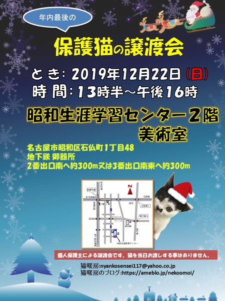 | イベント内容 | 年内最後の保護猫の譲渡会! 名古屋市昭和区 昭和生涯学習センター2階 美術室にて開催します。 子猫から 少し育った若猫、性格が安定した大人猫が ずっとのおうちを探しています。 個人保護主が集まって共同開催しております。 譲渡条件などは 個々の保護主よりますので 気になる猫さんがいましたら 保護主にお尋ね下さい。(^-^) 希望者の方には アンケート記入をお願いしております。 アンケートを元に お話しをさせて頂きます。 当日 猫を連れて帰る事は出来ません。 お車でお越しの場合 施設駐車場 もしくは 近隣のコインパーキング(有料)をご利用下さい。 路上駐車は 近隣住民のご迷惑になりますのでおやめください。 譲渡会会場はお借りしているだけですので 会場へのお問合せはご遠慮下さい。 最寄駅 地下鉄 御器所駅 |