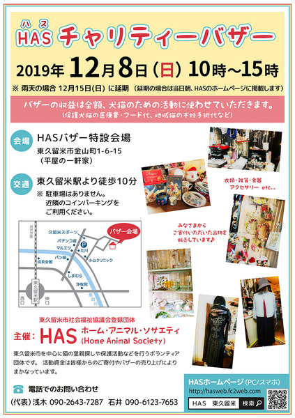 | イベント内容 | 東久留米市を中心に猫の里親探しや保護活動を行うボランティアグループHASが主催するバザーです。 収益金は全額犬猫の医療費、餌代、地域猫の不妊手術に使わせていただきます。 ご協力、よろしくお願いいたします。 |
