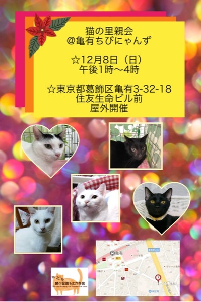 | イベント内容 | 12/8 猫の里親会@亀有ちびにゃんず 日曜日午後1時~4時 屋外開催の為雨天は中止 ご質問大歓迎です。 分からない事などなんでも聞いて下さい。 ご家族の皆様で生涯、家族の一員としてたっぷり愛情を注いでくださるご家庭をお待ちしております。 ご希望に添えない場合もございますのでご了承下さい。 【以下の方には譲渡しておりません】 ・猫の飼育が許可されていない住居にお住まいの方 ・未成年者、友人同士&同棲でお住まいの方、乳児のいるご家庭 ・単身者、高齢者のみのご家庭の方 ・脱走防止対策にご協力頂けない方 ・経済的に不安定な方(休職中、就職活動中、アルバイト等) ・仔猫の場合は留守番多いご家庭 ・住居の構造を聞かせていただく事があります。(階下への騒音など) 【当里親会は猫さんと里親様とのマッチングを大切にしています】 はじめて猫さんをお迎えする場合に適した猫さん、お留守番の長い里親さんに適した猫さん等、 お迎えする不安など経験豊富なスタッフがお話を聞き、アドバイスさせていただいています。 お気軽にお声をかけてください。 【ご負担頂く費用について】 譲渡の際に譲渡負担金(医療費の一部、譲渡金、お届け時の交通費)を里親様にご負担頂く事により 飼い主のいない猫の継続的治療や保護、新しいご家族の元へ送り出す事ができます。 ご理解とご協力をお願い致します。 ◆ご負担頂く医療費につきましては個々の猫(子猫、成猫、♂、♀)によって異なります◆ ★仔猫10.000~15.000 (ワクチン・ウイルスチェック・駆虫) ★成猫18.000~20.000 (ワクチンウイルスチェック・駆虫・不妊去勢手術済) ★猫をお届けする時の交通費をいただいております。 1500〜実費 【譲渡の条件がございます】 ①終生飼育 ②完全室内飼育 ③不妊・去勢手術 ④譲渡負担金 ⑤契約書の署名捺印 ⑥定期報告義務をご了承ください。 トライアル期間は全ての猫さんに設けております。 トライアル期間を経て初めて正式譲渡となります /////////////////////////////////////// 現在進行形で足立区より多頭飼育崩壊が発生しています。 保護預かりさんが必要です、お力をお貸しください。 https://www.adachianimalnet.org/ https://twitter.com/shosukereiko 【猫の里親をさがす会】 https://blog.goo.ne.jp/bobton |