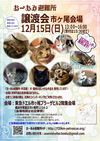 | イベント内容 | 可愛い仔犬・仔猫・成猫がたくさん、出場しますよ! 当日にはご来場できないかたも、ぜひお問い合わせください。 別日にお見合いの設定も可能です。 どうぞ、よろしくお願いします。 ☆★☆★☆★☆★☆★☆★☆★☆★☆★☆★☆★☆★☆★☆★☆★☆★☆★☆★☆ ~12月15日(日)市ヶ尾にて里親会開催!~ ◎場所・・「東急ドエル市ヶ尾プラーザビル2階集会場」 横浜市青葉区市ヶ尾町1154-2 東急田園都市線「市ヶ尾」駅より徒歩2分 ◎日程・・12月15日(日)(雨天決行) ◎時間・・13時から16時(受付は15時30分まで) (駐車場はございません。お車でお越しの際は近隣のコインパーキングをご利用ください) ■当日ご来場の方全員にアンケートを記入して頂きます。 ■下記リンクより事前にアンケートをご記入いただくと、待ち時間が短縮されます。 ★ 猫ご希望のかた向けアンケート https://goo.gl/ZNRFtI ★ 犬ご希望のかた向けアンケート https://goo.gl/pwWUMj ■アンケートで頂戴した個人情報は適切に管理し、里親さま決定のための資料としてのみ使用いたします。 ■アンケートをご提出いただいても、譲渡をお約束するものではないことをご承知置きください。 ※参加予定の猫は体調により参加できない場合があります。ご了承ください。 ※詳細はお問い合わせいただくか、ブログ・HPをご覧くださいませ。 おーあみ避難所ブログ:http://ameblo.jp/oami-hinanjyo おーあみ避難所HP:http://www.geocities.jp/oami_hinanjyo/ ☆★☆★☆★☆★☆★☆★☆★☆★☆★☆★☆★☆★☆★☆★☆★☆★☆★☆★☆ |