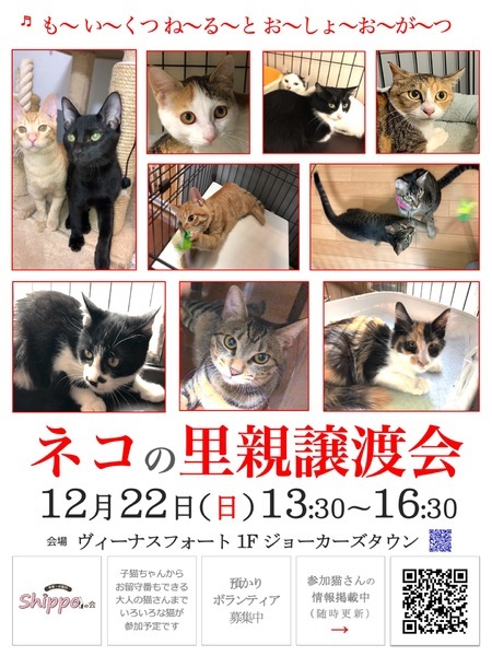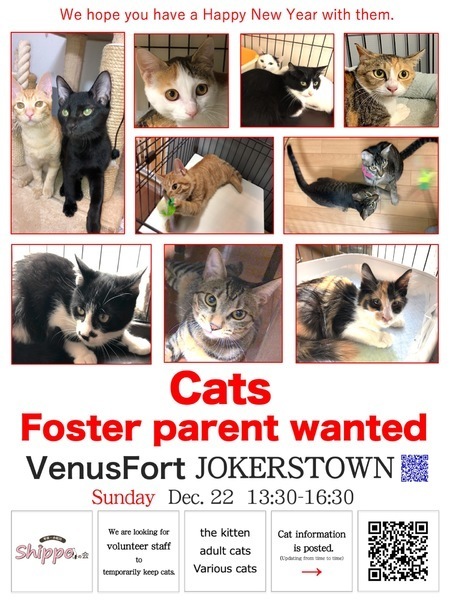 | イベント内容 | ヴィーナスフォートで里親譲渡会を開催致します。 13時30分スタートです! 参加猫さんはこちらからご覧下さい。(随時更新) ↓ https://www.pet-home.jp/member/user360938/post/ 子猫ちゃんたちも参加予定なので、小さい頃から一緒に暮らしたい、育てたいとお考えの方、ぜひお越しください! 一人暮らしの方やご高齢の方にもぴったりの、まったりした大人猫さんたちも参加予定です。 参加できない猫さんたちも、会場内で紹介予定です。 きっと、運命の出会いがあると思います。 里親希望の皆さま、ぜひ、足をお運びください! ●日時:12月22日(日) 13:30~16:30 ●会場:ヴィーナスフォート 1Fジョーカーズタウン内(ペットと暮らそう) 東京都江東区青海1-3-15 下記店内マップをご参照ください。 https://www.venusfort.co.jp/floormap/1f.html ●アクセス ゆりかもめ「青海駅」徒歩6分 りんかい線「東京テレポート駅」徒歩10分 ●参加猫および諸条件については、下記「ペットのおうち」からご覧ください。(随時更新) https://www.pet-home.jp/member/user360938/post/ ☆譲渡には当会における一定の条件があります。 ☆当会および里親譲渡会についてのお問い合わせ ☆外猫、保護猫のために物資のご支援を頂ける方がおりましたら、送付先をご連絡させていただきますのでご連絡下さい。 ☆預かりボランティアさん、活動のお手伝いをして頂ける方も随時募集中です。 hilakoma@yahoo.co.jp インスタグラム更新中 https://www.instagram.com/hirakomashippo/ |