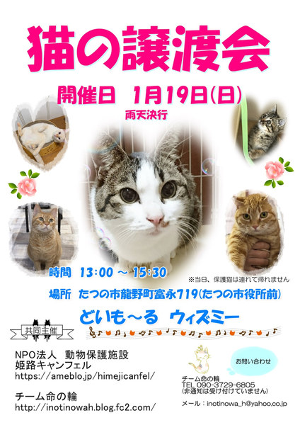 | イベント内容 | 猫の譲渡会 保護している猫ちゃんたちの里親募集をしています。 猫ちゃんを飼いたいと思っていらっしゃる方是非ご来場ください! 開催日時 2020年1月19日(日)雨天決行 13:00~15:30 会場 兵庫県たつの市龍野町富永719(たつの市役所前) どいもーるウィズミー(どいエルザ動物病院駐車場内) 駐車場あります! ※譲渡は先着順ではありませんが、お早めにお越しください ※当日猫ちゃんは連れて帰れません。後日お届けとなります ※保護主により譲渡条件は異なります。 主催者 NPO法人 動物保護施設 姫路キャンフェル https://ameblo.jp/himejicanfel/ & チーム命の輪 http://inotinowah.blog.fc2.com/ お問い合わせ先 チーム命の輪 090-3729-6805 (非通知は出ません) メール inotinowa_h@yahoo.co.jp |