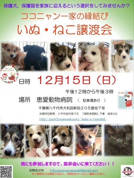 | イベント内容 | 子犬12匹、子猫3匹、大人猫1匹、大人犬1匹の大賑わい譲渡会です。 ぜひいらしてくださいね。無料駐車場もあります! https://ameblo.jp/coconyanikkanoenmusubi/entry-12554985617.html こちらに参加犬猫が掲載中です |