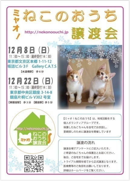 | イベント内容 | 参加する保護猫ちゃんについては、譲渡会一週間前からホームページにてご紹介しております。http://nekonoouchi.jp/ 事前予約はできません。譲渡会場でお会いしましょう。 譲渡会場では、入口で簡単なアンケートにお答えいただきます。 気になる猫ちゃんがいたらスタッフにお声がけください。 面談後、双方に不安がないようでしたら、トライアル開始日をご相談させていただきます。 譲渡会当日に猫ちゃんを連れて帰ることはできません。 トライアル開始日にご自宅にお届けします。 トライアル期間を経て問題がないようでしたら、譲渡成立となります。 詳細は、ホームページ【譲渡の流れ】ページでご確認いただけます。 ◇譲渡に関するお願い 【ミャオ!ねこのおうち譲渡会】では、以下のお約束をお願いしております。 ・完全室内飼いで終生愛育 ・脱走させないための対策 ・不妊去勢手術 ・譲渡誓約書の取り交わし ・医療費の一部ご負担 ・記念の写真撮影 ・原則として、譲渡時に60歳未満の方 その他、ひとり住まいで緊急時の対応に困難な方や、経済的に困難な世帯、必要な脱走対策を施していただけない場合はご遠慮頂いております。 また、保護主により譲渡条件が異なる場合もございますので、会場で十分にご相談ください。 譲渡までの流れ、譲渡時のお願い、医療費の一部ご負担などは、ホームページでご確認いただけます。http://nekonoouchi.jp/ |