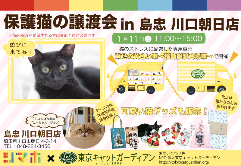 | イベント内容 | 幸せの黄色い車~移動譲渡会場車~in 島忠川口朝日店 幸せの黄色い車~移動譲渡会場車~が、島忠川口朝日店さんにやってきます! 猫のメンタルに配慮した、特別仕様の車です。 ケージ内は冷暖房完備・防音仕様の「幸せの黄色い車」の詳細についてはコチラ! https://tokyocatguardian.org/yellow_car/ 開催日は、twitterでも黄色い車で寛ぐ猫たちの写真を公開★ 猫たちに会いに来ていただけること 猫グッズ購入で支援してくださること 幸せの黄色い車を見に来ていただけること 全てがご支援になります。 お友達と、お誘い合わせの上ぜひよろしくお願いいたします! 会場では、可愛い猫グッズも販売します! しょんぼり顔のふわふわ猫、ふーちゃんのオリジナルグッズも限定発売★ 「子猫の家族になりたい」「可愛い猫グッズが欲しい」「遊びに行くことで支援したい」 という方は是非いらしてください! ★猫の里親になるには事前申し込みが必要です★ 申し込みはコチラ https://tokyocatguardian.org/cats_event/ 「幸せの黄色い車」の詳細についてはコチラ https://tokyocatguardian.org/yellow_car/ 【会場案内】 島忠 川口朝日 様 〒332-0001 埼玉県川口市朝日4-3-14 google map:https://goo.gl/maps/R848UPthnJL2 (アクセス) 【最寄り駅からの交通アクセス】 JR西川口駅 市立高校弥平行きバスにて 南4丁目下車 徒歩5分。 有明通り 前田東公園そば。南鳩ヶ谷駅下車徒歩5分。 【駐車場のご案内】 大型駐車場完備 料金:無料 |
