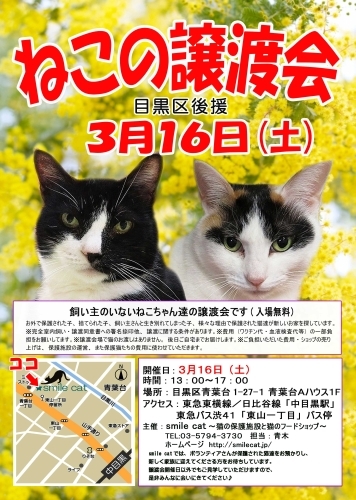 | イベント内容 | 「ねこの譲渡会 目黒区後援」開催! http://smilecat.jp/jyotokai/201903/jyot ... 90316.html ★仔猫ちゃん&被災地で保護されたねこちゃんも参加します! 日時:3月16日(土)13:00~17:00 場所:smile cat 施設内 目黒区青葉台1-27-1 青葉台Aハウス1F アクセス:東急東横線 ・ 日比谷線 中目黒駅(徒歩10分) 東急バス 渋41(渋谷駅西口バスターミナル33)~東山一丁目(徒歩1分) ※青葉台一丁目交差点右角(向かいにミニストップあり) smile catではボランティアさんが保護した猫ちゃん達をお預かりし、常時 新しく家族として迎えてくださる方をお待ちしています。 譲渡会には施設内いる猫ちゃんの他、ボランティアさんが保護されている 猫ちゃん達も沢山参加します。 【里親さん募集中のねこ達】 http://smilecat.jp/satooya/satooyabosyu.html これから猫ちゃんと暮らしてみたい方、先住猫ちゃんがいるけど大丈夫かしら? とご心配な方、その他飼育に関してご不安なことがありましたらご相談ください。 (譲渡には一定のトライアル期間を設けております) 運命の猫ちゃんとの出会いがあるかもしれません! 是非是非、会場に足をお運びください。 可愛い猫ちゃん達がお待ちしています♪ 参加猫ちゃんにつきましてはsmile catのホームページをご覧ください ※譲渡会開催日だけでなく、施設内では常時里親さん募集中です! ご見学していただける時間はホームページをご覧ください。 (ペット同伴でのご入場はできません) 主催:smile cat~猫の保護施設と猫のフードショップ~ http://smilecat.jp/ シェルターブログ: http://smilecat222.blog.fc2.com/ 掲載されている子以外にも沢山の猫ちゃん達が参加しますので、 気になる子がいましたら事前にお問い合わせください。 お問い合わせ先 info@smilecat.jp 里親さんになっていただくにあたって以下のことをお願いしています。 http://smilecat.jp/satooya.html(事前にご確認ください「里親希望について」) 【注意事項】 ・終生家族として大切にしていただきたく、譲渡に関してはアンケート用紙にご記入の上 飼育環境等のご質問をさせていただきます (個人情報は猫の譲渡に関してのみ使用し、責任を持って管理いたします。 譲渡が成立しなかった場合、責任を持って破棄いたします) ・譲渡に関しては、完全室内飼い・不妊手術をしていただくこと・定期報告・譲渡同意書への 署名捺印他、いくつか条件があります。 ・ご家族全員同意が必要です、出来るだけご家族全員でお越しください。 ・一部費用のご負担をお願いしています(ワクチン・不妊手術代等) ・譲渡会場での猫のお渡しはありません。後日ご自宅までお届けします。 ・未成年の方・学生さん、ご高齢のお一人暮らしの方には譲渡出来ません。 smile catでは、猫ごはん・グッズも取り扱っております (売り上げは猫ちゃんの飼育費用・施設の運営に使わせていただきます) 1匹でも多くの猫ちゃんに素敵なご縁がありますよう、皆様のお越しを心よりお待ちしています。 |