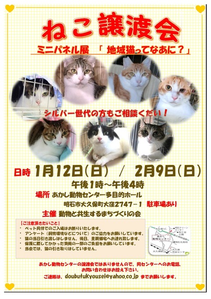 | イベント内容 | 場所○あかし動物センター多目的ホール 無料駐車場有 主催○動物と共生するまちづくりの会 多頭飼育現場で、今現在も吹きさらしの農具倉庫に並べられたケージで暮らしている猫たちの救済譲渡会です。 農具倉庫に約20匹、室内や外の猫を合わせれば50匹近くの猫が、高齢の飼い主の元、いつまで世話を受けられるわからない状況下で暮らしています。 これまで愛情を注がれたことのない猫たちですので怖がりな子が多いですが、先に里親さまに迎えられた怖がりさんも、今ではお家ですっかり甘えっこに変身しています。 大人しい子が多く、落ち着いた大人猫ばかりです。また、餌の世話はきちんとされており、どの子毛艶がよく健康です。 猫との優しい生活を望んでおられる方、シルバー世代の里親様もぜひご相談ください。 どうぞ、寒いケージから暖かいお家に迎えてやってください。 譲渡会でお待ちしています! 参加猫の里親さん募集記事も載せています。ぜひご覧になって下さい。 |