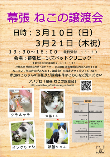 | イベント内容 | 3月10日(日)開催 「幕張 ねこの譲渡会」 千葉市幕張にてねこの譲渡会を開催致します。 いつでも里親募集中「幕張 ねこの譲渡会」出会いを待っているねこちゃん一覧はコチラ https://www.satoya-boshu.net/keisai/sam ... &id=294132 (二重投稿になってしまうので全頭は載せておりません。参加ねこ全頭はブログにてご確認下さい) 最終的な参加ねこのご確認はコチラでお願い致します ブログ「幕張 ねこの譲渡会」 http://ameblo.jp/makunekojyoutokai/ こちらにも随時掲載していきます。 譲渡会直前の掲載もあり得ますので、随時チェックして下さると嬉しいです *開催日 3月10日(日) 13:30より16:00 (午前の診察が終わり次第設営です) 最終受付 15:30 *会場 幕張ビーンズペットクリニック http://www.m-beans.com/ 〒262−0032 千葉市花見川区幕張町5−417−135 周辺交通機関 JR総武線「幕張」駅より南へ徒歩7分 JR京葉線「海浜幕張」駅より北へ徒歩11分 周辺道路交通網 国道14号(千葉街道)「幕張町5丁目」交差点を南へ直進 国道357号 「若葉」交差点を北へ直進 駐車場は病院駐車場5台あります。詳細はコチラをご覧下さい。 http://www.m-beans.com/parking.html その他 三井のリパーク 幕張町5丁目 60分200円 12時間最大600円 譲渡会のお問い合わせは「幕張ビーンズペットクリニック」では無く、こちらにお願い致します makunekojyoutokai★★★@gmail.com (★★★を@に変えてお送り下さい) :::::::::::::::::::::::::::::::::::::::::::::::::::::::::::::::::::::::::::::::::::::::::::::::::::::: 譲渡会は1匹でも多くのねこちゃんが、ひとりでも多くのご希望者様とお見合いをして頂き、 ご縁が繋がることを目的としています。 「開催時間中に1匹でも多くのお見合い」を優先したい為、 混みあった場合は最低限のご説明だけにさせて頂き、 詳細は後日メールやお電話にて対応させて頂く事もございます。 予めご了承下さい。 ::::::::::::::::::::::::::::::::::::::::::::::::::::::::::::::::::::::::::::::::::::::::::::::::::::: 「譲渡の流れ・および譲渡条件」 20年の寿命のあるねこちゃんです。 譲渡条件を設定させて頂いております。 何卒ご了承の程、よろしくお願い 致します。 ・譲渡会当日のねこちゃんのお渡しはしておりません。 スタッフより後日ご自宅へお届けとなります。 ・ねこちゃんとお見合いの後、譲渡条件などをお話させて頂き、お話がまとまりましたら 後日スタッフよりご自宅へお届けとなります。 ・トライアルの有無や期間は保護主さんにより異なります。 ・お届けの際、飼育環境を確認させて頂き、脱走防止対策の確認と身分証明書のご確認、 書類の取り交わしなどがございます。 ・譲渡会会場でお聞きしていた事と相違があった場合など、ねこちゃんを連れて帰る場合もございますので 予めご了承下さい。 ・学生さん、未成年の方への譲渡は行っておりません。 ・単身者の方・ご高齢の方への譲渡は基本的にはお断りさせて頂いております * 譲渡条件 * 「終生、愛情を持って家族としてお迎え頂ける方」 「完全室内飼いをお約束頂ける方」 「脱走防止に努めて下さる方」 「万一脱走があった際は、必ず捜索に努めて下さる方」 「1回目の発情前に、必ず不妊・去勢手術を施して下さる方」 「ねこちゃんが具合が悪くなった時には、病院へ連れて行き医療を施して下さる方」 「先住のねこちゃんも同様の飼い方をされている方」 「保護時にかかっている医療費の一部とお届け時の交通費のご負担をお願い出来る方」 「メールでの写真付き定期報告が可能な方(トライアル中は毎日、その後1カ月間は週1、その後5か月間は月1、その後毎年 正式譲渡の日)」(トライアルの有無は保護主さんによって異なります) 「ねこを飼える状態の方」 :::::::::::::::::::::::::::::::::::::::::::::::::::::::::::::::::::::::::::::::::::::::: Twitter、Facebook、instagramもよろしくお願い致します! ::::::::::::::::::::::::::::::::::::::::::::::::::::::::::::::::::::::::::::::::::::::: 「保護猫と暮らそう」 新しい小さな家族と出会いに、ぜひご家族皆様でお越しください。 小さな譲渡会ではありますが、スタッフ一同 皆様のご来場を心よりお待ちしております! |