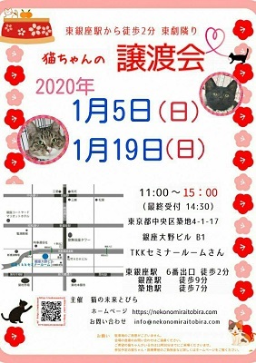 | イベント内容 | 東銀座で保護猫の譲渡会を開催しています「猫の未来とびら」です♪ 恵まれない環境にいる猫たちが未来へのとびらを開いて幸せなご縁に繋がる橋渡しをしていきます。 たくさんの猫ちゃんと保護主・スタッフ一同みなさまのご来場を心よりお待ちしています! 子猫ちゃん〜成猫ちゃんまで参加します♪ ★開催日時 2020年1月5(日) 11:00~15:00 (最終受付 14:30) ★会場 東京都中央区築地4-1-17 銀座大野ビル B1 TKKセミナールームさんにて (東劇となり) ★最寄駅 東銀座駅 6番出口 徒歩2分 銀座駅 徒歩9分 ・築地駅 徒歩7分 駐車場のご用意はございませんので近隣のコインパーキング等をご利用ください。 会場への直接のお問い合わせはご遠慮くださいませ。 ★☆★★☆★★☆★★☆★★☆★★☆★★☆★★☆★★☆★ 会場で猫ちゃんと触れ合ってご縁を繋いでください。 里親様・猫ちゃんが双方、幸せな家族になれるよう保護主・スタッフがサポート致します。 ご不安な事はお気軽にご相談ください。 入場無料です。事前のご予約は必要ございません。 ご希望の猫ちゃんがいらっしゃる里親希望者様は11時~11時30分までに会場へお越しください。 11時30分までに受付されたすべての里親希望者様と保護主がお話をさせて頂き 1匹に複数のお申込み、里親様と猫ちゃんに合うご家庭がございましたら 受付を終了する場合もございます。 里親様が決まっていない猫ちゃんに関しましては随時保護主とご相談ください。 当日猫ちゃんの引き渡しはございません。 後日、保護主が里親様宅へお届けいたします。 ※参加予定猫ちゃんは、急な体調不良等で不参加になる場合もございます。 開催当日の朝、当会ブログにて不参加の最新情報を掲載致しますのでご確認をお願い申し上げます。 ◇譲渡に関してのお願い・基本条件 1.家族の一員として終生最期まで愛育下さい。 2.完全室内飼い・ペット可のお住まい 3.脱走防止対策 4.避妊・去勢手術 5.里親様のご自宅へのお届け 6.譲渡誓約書への署名捺印・身分証明書の提示 7.医療費譲渡金のご負担 8.定期報告 9.トライアル期間有り ※保護主により譲渡条件は異なりますので会場で直接ご相談ください。 60才以上の方のみのご家庭、未成年の方、単身の方、同棲中の方、 必要な脱走対策を施していただけない方は譲渡が難しい場合もございますのでご了承ください。 小さな子猫の譲渡は体重が1kgになってからのお届けやお留守番の無い(少ない)ご家庭を希望いたします。 医療費譲渡金に関しましては詳しくはホームページの 【譲渡に関してのお願い】【譲渡の流れ】をご覧くださいませ。 〜主催 猫の未来とびら〜 |