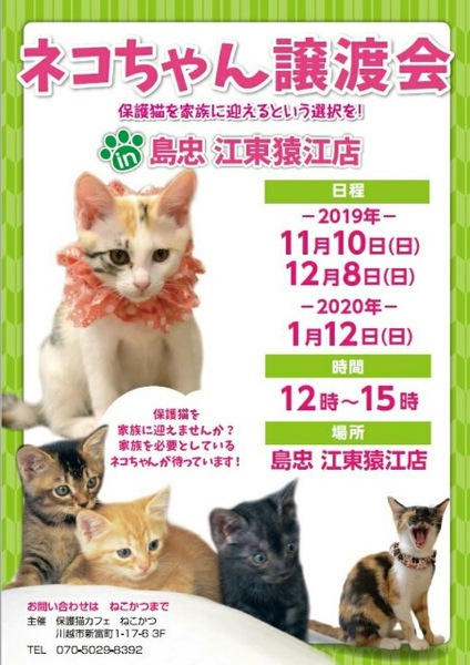 | イベント内容 | 1月12日(日)保護猫カフェ「ねこかつ」さん主催の譲渡会が開催されます。 子猫から中猫から成猫迄沢山の猫達が参加予定です。 日時 1/12(日)12:00〜15:00 会場 島忠江東猿江店(江東区猿江 2-16-3)4F アクセス 東京メトロ半蔵門線・都営新宿線住吉駅B1出口より徒歩2分 参加団体 ねこかつ・浦和キャッツ 子猫から中猫から成猫さんまでいろいろな世代の子達が沢山参加予定です。 ぜひ足をお運び下さい。 譲渡にはお願いごとがございます。譲渡条件をご確認下さい。 浦和キャッツ「http://urawacats.blog133.fc2.com/」をご覧下さい。 参加猫達は 浦和キャッツ http://urawacats.blog133.fc2.com/ または 翔べ!しっぽの猫たち https://ameblo.jp/shippocats-ganba2016/ をご覧下さい。 不幸な犬や猫が沢山います。 浦和キャッツは猫の保護活動をしていますが助けられる猫はほんの少し。 なんとか保護出来た子はみんな幸せへと送り出したいと強く思い活動しています。 猫と暮らしたいと思われましたらぜひ保護猫を家族に迎えて頂けます様に。 尚、天候などにより里親会が開催されない場合があります。 当日朝のブログにてお知らせしますので、予めご確認お願いします。 |