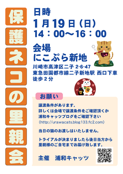 | イベント内容 | 1月19日(日)にこぷら新地にて8回目の保護猫の里親会を開催します。 猫を家族に迎え入れることをご検討されている方、保護猫にご興味のある方、多くの方のご来場をお待ちしております。 日時 1月19日(日)14:00〜16:00 会場 にこぷら新地 川崎市高津区二子2-6-47 アクセス 東急田園都市線 二子新地駅 西口下車徒歩1~2分 高架下のプロムナード沿いなので、雨でも、炎天下でも傘なしでOKです。 参加団体 浦和キャッツ 室内での開催なのでゆっくりと猫と触れ合って頂けます。 子猫から中猫から成猫さんまでいろいろな世代の子達が沢山参加予定です。 ぜひ足をお運び下さい。 譲渡にはお願いごとがございます。譲渡条件をご確認下さい。 浦和キャッツ「http://urawacats.blog133.fc2.com/」をご覧下さい。 参加猫達は 浦和キャッツ http://urawacats.blog133.fc2.com/ または 翔べ!しっぽの猫たち https://ameblo.jp/shippocats-ganba2016/ をご覧ください。 不幸な犬や猫が沢山います。 浦和キャッツは猫の保護活動をしていますが助けられる猫はほんの少し。 なんとか保護出来た子はみんな幸せへと送り出したいと強く思い活動しています。 猫と暮らしたいと思われましたらぜひ保護猫を家族に迎えて頂けます様に。 尚、天候などにより里親会が開催されない場合があります。 当日朝のブログにてお知らせしますので、予めご確認お願いします。 |