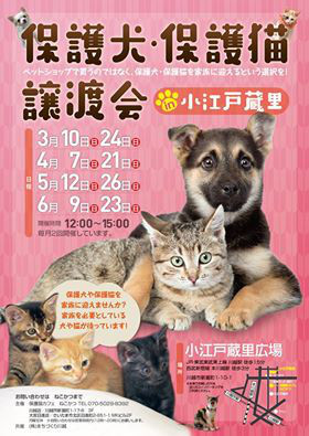 | イベント内容 | 観光施設小江戸蔵里さんの広場をお借りして 犬猫の譲渡会をさせていただきます。 家族を必要とする 中型犬や小型犬などの保護犬や 保護猫たちとお待ちしています。 ※複数の保護団体・個人が参加します。 ご希望される犬・猫ごとに 譲渡条件などをご確認ください。 ●日時 3月10日(日) 12:00~15:00 ●場所 川越小江戸蔵里 【蔵里へのお問い合わせはご遠慮ください】 http://www.machikawa.co.jp/ 埼玉県川越市新富町1-10-1 東武東武東上線 川越駅より 徒歩15分 西武新宿線 本川越駅より 徒歩3分 ●主催 保護猫カフェ ねこかつ http://cafe-nekokatsu.com/ ブログ http://ameblo.jp/cafe-nekokatsu/ https://www.facebook.com/cafe.nekokatsu インスタグラム https://www.instagram.com/hogonekocafe_nekokatsu/ ●今後の開催予定 ---------------- 3月24日(日) 4月7日(日) 4月21日(日) 5月12日(日) 5月26日(日) 6月9日(日) 6月23日(日) 7月8月はお休みです |