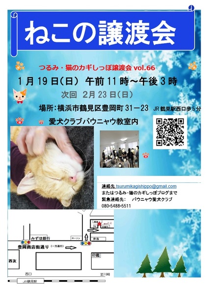 | イベント内容 | 横浜 つるみ・猫のカギしっぽ譲渡会vol.66 日時: 1月 19日 日曜日 午前11時~午後3時 場所: 横浜市鶴見区豊岡町31-23 愛犬クラブ バウニャウ教室内 JR鶴見駅西口より 徒歩5分) 参加猫一覧はこちらをご覧ください http://tsurumineko.blog9.fc2.com/blog-entry-2300.html つるみ・猫のカギしっぽブログ http://tsurumineko.blog9.fc2.com/ 譲渡会情報 http://tsurumineko.blog9.fc2.com/blog-entry-2299.html 空調の利いた室内での譲渡会です(雨天でも開催)。 フリーになっている猫もいます、 猫を触る際は必ずスタッフの指示に従ってください。 お見合いをご希望の際にはアンケート用紙に 環境(住宅・家族構成・住所etc)をご記入いただいています。 譲渡条件・譲渡費用については、予めこちらをご覧ください ⇒ 猫の譲渡について https://blog-imgs-124-origin.fc2.com/t/s/u/tsurumineko/20190205224838245.jpg *子猫については長時間のお留守番のないご家庭を探しています *個人保護者の保護猫に関しては 会とは譲渡条件が異なる場合があります、 それぞれの猫の紹介記事に譲渡条件、費用等について 併記しておりますので、ご覧ください。 当日のお届けはしておりません。 後日、住所・ご家族様の同意などの確認のためご自宅までお届けいたします。 トライアル時書類をご記入いただきます。 *譲渡会前にお話の進む場合もあります、 気になる子がいらした方は事前にお問い合わせをお願いいたします。 ➡ tsurumikagishippo@gmail.com 緊急連絡先:080-5488-5511 (譲渡会についてのお問合せに限らせていただきます) |