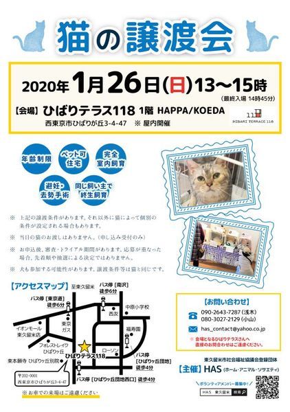 | イベント内容 | 東京都東久留米市を中心に猫の保護活動を行うボランティア団体【HAS(ホーム・アニマル・ソサエティ)】が主催する譲渡会です。 ※譲渡が決定した里親さんには、医療費として 避妊去勢手術代、ワクチン代、検査代などをご負担いただきます。(猫により金額に違いがあります) 保護猫の一時あずかりボランティアさんを募集しています。 条件がありますので、詳しくはHASのホームページをご覧ください。 http://hasweb.fc2web.com/volunteer/keep.html |