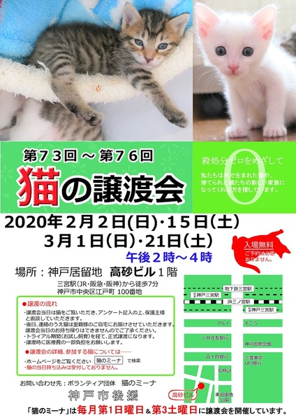 | イベント内容 | 参加猫たちは、行政から引き取った子猫や、多頭崩壊から救出された猫たち、捨てられた猫たち、TNR活動中に保護された猫たちと、命を救われた猫たちが新しいお家を探しに、参加をします。 馴れている猫は抱っこをして頂けます。 新しい家族を迎えられたい方はご来場ください。 猫は20歳まで生きますので、最後まで責任を持って育ててくださる方など、条件があります。 ペット飼育不可にお住まいの方はご遠慮いただいております、ご了承ください。 猫はこちらからお宅までお届けさせて頂き、その後お試し期間を設けております。 先住猫や人の家族との相性をみてから、正式譲渡となります。 ホームページ ; 猫のミーナ http://nekonomina.com/ ブログ ; 猫のミーナといっしょ http://miina300.blog.fc2.com/ ねこのオカン http://ameblo.jp/miina300/ |
