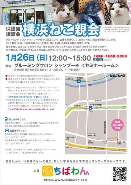 | イベント内容 | 横浜市南区「グルーミングサロン シャンプーチ」さまのご厚意により、セミナースペースをお借りしてねこ親会を開催いたします。 見学は予約等必要ありません。是非かわいい猫たちに会いに来てください。 参加猫情報は順次更新されます。 ちばわんHPをご覧ください。 http://chibawan.net/eventcat/eventall なお、千葉県市川市、東京都葛飾区、港区赤坂でもねこ親会を開催中です。詳しい日程などはちばわんのHPからご覧ください! ◆◆◆◆◆◆◆◆◆◆◆◆◆◆◆◆ 日時 1月26日(日)12:00-15:00 場所 232-0021 横浜市南区真金町1-1-2 浅見ビル1F 室内開催 雨天決行(荒天中止) ◆◆◆◆◆◆◆◆◆◆◆◆◆◆◆◆ 【会場内でのお願い】 ・当日、会場内への犬猫等の愛玩動物の同伴は出来ません。 ・譲渡が決定した場合、後日猫をご自宅へお届けいたします。当日猫をお引渡しすることはございません。 【アクセス】 ・横浜市営地下鉄ブルーライン「阪東橋駅」より徒歩9分 ※会場に駐車場はありません。車でお越しの場合は、付近のコインパーキングをご利用ください。 電車・バスなどの公共の交通機関の利用をお勧めいたします。 【当日の流れ】 (1)家族募集中のねことお会いになりたい方はどなたでも自由にご参加いただくことができます。ちばわんボランティアは名札をつけておりますので、お声をかけて下さい。 預かりボランティアが控えておりますのでねこの性格や生活習慣など、遠慮なくご質問ください。 (2)ご希望の子が決まったら、お申し込みアンケートにご記入の上、ボランティアにお渡し下さい。 (前日までにメールでアンケートを送信してお申し込みいただくこともできます。) ◆「ねこ」アンケート送信先:(以下URLをクリックするとフォームが開きます) http://chibawan.net/contactform_cat (3)アンケート内容を拝見し、お話させていただきます。 (4)原則として一両日中にお返事の連絡をさせていただきます。 (5)ご縁が成立した場合には、後日、こちらからご自宅まで猫をお届けし、約1ヶ月のお試し生活に入っていただきます。お届けの際に、書面での譲渡契約書を交わします。 ※ワクチン・不妊手術代など保護にかかった費用は、家族になる方にもご負担をお願いしています ◆ねこ親会について:(以下URLをクリックするとフォームが開きます) http://chibawan.net/inquiry_cat ※イベント当日はメールを見ることが出来ません。また、お問い合わせの際は、必ず「具体的な件名」を入れて多数の迷惑メールと区別がつくようにお願いいたします。 ※業務に支障がでる恐れがありますので本イベントに関するグルーミングサロン・シャンプーチ様へのお問い合わせはご遠慮ください。 |
