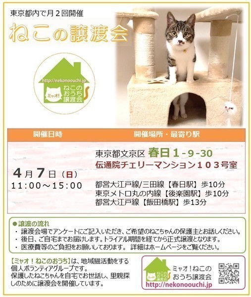 | イベント内容 | 参加する保護猫ちゃんについては、譲渡会一週間前からホームページにてご紹介しております。 事前予約はできません。譲渡会場でお会いしましょう。 ※お問い合わせはホームページ内の【お問い合わせ】からお願い致します。保護主は日々、猫ちゃんのお世話と仕事に忙しくしておりますので、お返事に数日頂くこともございます。ご了承ください。 譲渡会場では、入口で簡単なアンケートにお答えいただきます。 気になる猫ちゃんがいたらスタッフにお声がけください。 面談後、双方に不安がないようでしたら、トライアル開始日をご相談させていただきます。 譲渡会当日に猫ちゃんを連れて帰ることはできません。 トライアル開始日にご自宅にお届けします。 トライアル期間を経て問題がないようでしたら、譲渡成立となります。 詳細は、ホームページ【譲渡の流れ】ページでご確認いただけます。 ◇譲渡に関するお願い 【ミャオ!ねこのおうち譲渡会】では、以下のお約束をお願いしております。 ・完全室内飼いで終生愛育 ・脱走させないための対策 ・不妊去勢手術 ・譲渡誓約書の取り交わし ・医療費の一部ご負担 ・記念の写真撮影 ・原則として、譲渡時に60歳未満の方 その他、ひとり住まいで緊急時の対応に困難な方や、経済的に困難な世帯、必要な脱走対策を施していただけない場合はご遠慮頂いております。 また、保護主により譲渡条件が異なる場合もございますので、会場で十分にご相談ください。 譲渡までの流れ、譲渡時のお願い、医療費の一部ご負担などは、ホームページでご確認いただけます。 ※お問い合わせは、ホームページ内の【お問い合わせ】からお願い致します。お返事に数日頂くこともございますが、ご了承ください。 |