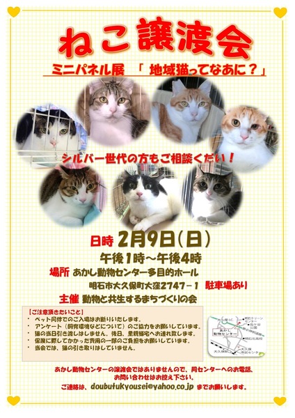 | イベント内容 | 【場所】あかし動物センター多目的ホール 無料駐車場有 【主催】動物と共生するまちづくりの会 多頭飼育現場で、今現在も吹きさらしの農具倉庫に並べられたケージで暮らしている猫たちの救済譲渡会です。 農具倉庫に約20匹、室内や外の猫を合わせれば50匹近くの猫が、高齢の飼い主の元、いつまで世話を受けられるわからない状況下で暮らしています。 これまで愛情を注がれたことのない猫たちですので怖がりな子が多いですが、先に里親さまに迎えられた怖がりさんも、今ではお家ですっかり甘えたさんに変身しています。 大人しく落ち着いた大人猫ばかりです。 また、餌の世話はきちんとされており、どの子毛艶がよく健康です。 猫との優しい生活を望んでおられる方、シルバー世代の里親様もぜひご相談ください。 どうぞ、寒いケージから暖かいお家に迎えてやってください。 譲渡会でお待ちしています! 参加猫の里親さん募集記事も載せています。ぜひご覧になって下さい。 |