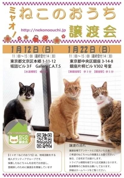 | イベント内容 | 参加する保護猫ちゃんについては、譲渡会一週間前からホームページにてご紹介しております。http://nekonoouchi.jp/ 事前予約はできません。譲渡会場でお会いしましょう。 譲渡会場では、入口で簡単なアンケートにお答えいただきます。 気になる猫ちゃんがいたらスタッフにお声がけください。 面談後、双方に不安がないようでしたら、トライアル開始日をご相談させていただきます。 譲渡会当日に猫ちゃんを連れて帰ることはできません。 トライアル開始日にご自宅にお届けします。 トライアル期間を経て問題がないようでしたら、譲渡成立となります。 詳細は、ホームページ【譲渡の流れ】ページでご確認いただけます。 ◇譲渡に関するお願い 【ミャオ!ねこのおうち譲渡会】では、以下のお約束をお願いしております。 ・完全室内飼いで終生愛育 ・脱走させないための対策 ・不妊去勢手術 ・譲渡誓約書の取り交わし ・医療費の一部ご負担 ・記念の写真撮影 ・原則として、譲渡時に60歳未満の方 その他、ひとり住まいで緊急時の対応に困難な方や、経済的に困難な世帯、必要な脱走対策を施していただけない場合はご遠慮頂いております。 また、保護主により譲渡条件が異なる場合もございますので、会場で十分にご相談ください。 譲渡までの流れ、譲渡時のお願い、医療費の一部ご負担などは、ホームページでご確認いただけます。http://nekonoouchi.jp/ |