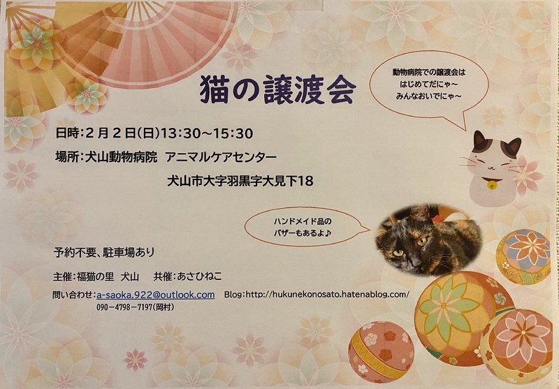 | イベント内容 | 福猫の里 犬山主催の譲渡会です。あさひねこさんと共催で譲渡会を開催致します( ˶˙ᵕ˙˶ ) お問い合わせ:a-saoka.922☆outlook.com お問い合わせする際は☆を@に変えてお問い合わせくださいm(_ _)m 猫を飼う場合は、室内飼いとしその猫を生涯を通じて責任をもって育てて下さい。 当日猫をお渡しすることはしていません。飼育環境を確認させていただくため、後日ご自宅までお届けします!また、譲渡誓約書を取り交わします。なお、ペット不可物件にお住まいの方への譲渡はお断りしています。学生(未成年)の方は保護者の同意があれば譲渡可です。 譲渡を希望される方には譲渡会でアンケート記入をお願いしています。アンケートの内容をもとにお話を進めさせていただきます。 猫たちの願いは、生涯大切にしてくれる里親さんに出会うことです。 みなさんぜひ一度可愛い猫たちに会いに来てくださいね。 お待ちしております♪ ------------------------------------------------ 【随時ブログ更新中】 福猫の里 犬山:https://hukunekonosato.hatenablog.com/ あさひねこ: http://owariasahineko.blog.fc2.com/?mp=92912 ------------------------------------------------ |