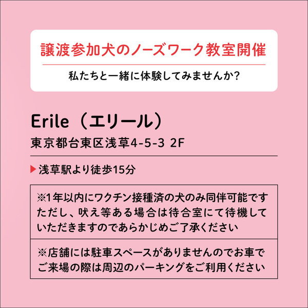 | イベント内容 | 「保護犬ってどんな子たち?」 「いぬ助けってどんな団体?」 「今は迎えられないけれど話を聞いてみたい」 など、ご興味のある方はぜひお越しください。 ボランティアメンバーがご質問にお答えいたします。 参加犬情報などはいぬ助けのホームページをご覧ください。 https:www.inudasuke.com 犬を同伴される皆様へ 近隣のご迷惑になる場所で排泄をさせないようお願い致します。 してしまった場合、ペットシーツで吸い取ったあと水を流して下さい。 便は必ずお持ち帰り下さい。また、路上駐車はせず お近くのコインパーキングをご利用ください。 ご協力をお願い致します。 |