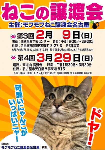 | イベント内容 | モフモフねこ譲渡会名古屋 猫たちの幸せなお家探しのために譲渡会を開催しております。 個人ボランティアの集まりです。 自分たちの出来ることから頑張っております! 一匹でも幸せになれる猫が増えますように 場所 瑞穂生涯学習センター 第3集会室 住所 名古屋市瑞穂区惣作町2-27-3 時間 13時30分~15時30分 交通機関等 地下鉄「妙音通」下車1番出口より徒歩8分 駐車場19台(満車の場合は近隣コインPをご利用ください) 参加猫の情報は下記モフモフねこ譲渡会名古屋ブログにてご確認ください。 https://mofumofuneko4.fc2.net/ 【譲渡会について】 ・譲渡会は入場無料、予約不要です。お気軽にご参加ください。 ・会場へのお問い合わせはご遠慮ください。 ご質問は下記メールアドレスへお願いいたします。 mofumofuneko4☆gmail.com ☆を@に変更してお問い合わせください。 ・猫の引き取りはしておりません。 ・譲渡会当日に猫をお渡しすることはありません。 ・保護主によって譲渡条件が違う場合があります。 ・参加予定でも譲渡会前にトライアルになる場合があります。 ご希望の猫がいましたらまずはお問い合わせをお願いいたします。 【参加猫について】 ・ノミ駆除、駆虫、トイレ躾、ワクチン3種接種済。 ・年齢や健康状態に応じて、避妊手術を行っております。 ・参加予定で紹介していても当日体調不良等で欠席になる場合があります。 【譲渡の約束事】 ・ペット飼育可の住宅にお住まいの方。 ・完全室内飼育。 ・脱走防止の対策をしていただける方。 ・避妊手術未実施の場合、避妊手術 の実施と報告をしていただける方。 ・ご家族全員が猫を飼うことに同意していること。 ・譲渡後、しばらく定期連絡を入れていただける方。 *お一人暮らしの方、60歳以上の方は、身内の方の保証を必要となる場合がございます。 |