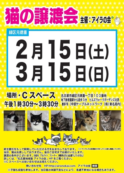 | イベント内容 | 2/15(土) 名古屋市緑区徳重にて譲渡会開催 場所:中部ケーブルネットワーク 東名局 Cスペース内 住所:名古屋市緑区元徳重1丁目103番地 開催時間 13:30~15:30まで 地下鉄 徳重駅から徒歩3分 主催 名古屋地域猫 アイラの会 予約不要ですが、 ご来場前に必ず譲渡の約束事を「踊るココちゃんブログ」でご確認ください。 http://airanokai.blog.fc2.com/ 参加猫もこちらのブログに準備で来次第掲載してゆきます。 主催:名古屋地域ネコ アイラの会 http://airanokai.com/ ※当日ご都合が悪い場合、別途お見合いも致します。 問い合わせ先 airanokai$gmail.com $を@に変えて送ってください。 http://airanokai.com/ でご覧ください。 当日ネコをお渡しすることはしていません。 飼育環境を見届けさせていただくため、後日ご自宅までお届けします。 譲渡誓約書を取り交わします。詳細はHPをご覧ください。 なお、お一人暮らしの高齢者の方は、身内の方の保証を必要とします。 ペット不可物件にお住まいの方、学生、フリーター、同棲カップル、無職の方への譲渡はお断りしています。 予めご了承ください。 ☆譲渡会では、アンケートのご記入をお願いしています。 アンケート内容をもとにお話をすすめさせていただきます。 猫を迎えることに関し、ご家族の了解を得ており、家族の一員として責任を 持って迎えていただける方にのみ譲渡させていただきます。 |