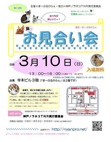 | イベント内容 | 3月10日(日)13:00~16:00 会場 :寺本ビル3階(まーぶるかふぇは2階です) 高砂市神爪1丁目5-24 アクセス 山陽本線 宝殿駅より徒歩2分 駐車場はございません。近隣の℗をご利用ください。 *ご来場の方は飲食をワンオーダーお願いします。 神戸ノラネコTNR実行委員会のメンバーや協力ボランティアさんたちは、不幸な命の誕生を防ぐ活動(=TNR)とともに、今ある命を救済する活動(=猫を保護、預かっておうちを探す譲渡活動)にも力を入れています。 1匹でも多くの保護猫が新しい家族と出会い、ずっと暮らせるようにご縁をつなぐ「猫のお見合い会」の西部拠点・保護猫カフェ「まーぶるかふぇ(Marble CAFE)」(高砂市神爪)で、2018年4月から、毎月定期開催しています。 慣れている猫は触ったり、抱っこもしたりして触れ合いながらのお見合いができます。ぜひお立ち寄りください。 当日の猫の引き渡しはしておりません。 必ずご自宅にお届けします。 年齢等の条件がございます。詳しくはスタッフにお尋ねください。 医療費などの一部負担をお願いします。 主催 まーぶるかふぇ 協力 神戸ノラネコTNR実行委員会 |