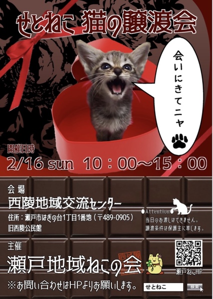 | イベント内容 | 猫の譲渡会を開催します★ 子猫から大人猫まで、いろんな柄の可愛い子達が参加します。 室内につき、冷暖房完備! 駐車場もあります。 ぜひ遊びに来てくださいね! |