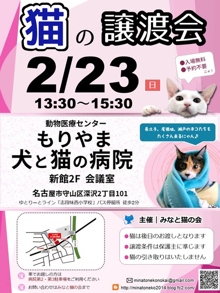 | イベント内容 | =みなと猫の会 第232回譲渡会のお知らせ== 新しい家族を待つ猫たちに 会いに来ませんか? ◆ペットショップへ行く前にぜひ譲渡会へ◆ トイレトレーニングや 基本的な健康診断を終わらせた 生後4ヶ月~8才くらいの 猫たちが大集合! ○主 催 みなと猫の会 ○日 時 2月23日(日)13:30~15:30 ○場 所 動物医療センターもりやま犬と猫の病院 新館2F 会議室 名古屋市守山区深沢2-101 ゆとりーとライン 志段味西小学校バス停留所 徒歩2分 https://goo.gl/maps/oPzQu3PWqE32 ※車でお越しの場合は 病院第2・第3駐車場をご利用ください ※お問い合わせは会場ではなく minatonekonokai@gmail.comまで ○参加猫について ・参加している猫は、ワクチンや駆虫等の基本治療を済ませています。 また、年齢に応じて避妊去勢手術を行っています。 ・参加予定猫が体調不良などで急遽不参加になることもあります。 ○ご来場の皆様へ ・譲渡会の見学は入場無料・予約不要です。 ・当日に猫をお渡しすることはありません。 後日ご自宅までお届けに伺います。 ・一週間から二週間のトライアル期間後、正式譲渡となります。 ・トライアル及び譲渡の際には 完全室内飼い・ご家族の同意・脱走防止策・ アンケート記入など諸条件がございます。 ・里親様には治療費の一部ご負担をお願いしております。 これ以上不幸な猫を増やさないための 治療費とさせて頂きますので何卒ご理解ください。 ・非会員の個人保護者も参加しています。 譲渡条件やトライアルは猫の保護者に準じます。 ・譲渡会の流れ http://minatoneko2014.blog.fc2.com/blog-entry-11.html ○参加猫情報は随時更新中! ↓↓参加猫一覧↓↓ http://minatoneko2014.blog.fc2.com/blog-entry-493.html ○猫に関する相談も受け付けています ねこについての困りごと、トラブルなどを抱えている方、 相談へいらっしゃいませんか。 ○次回以降の譲渡会予定 決まり次第お知らせいたします ◎主催者ブログ みなと猫の会 ~こぴっと猫だより~ http://minatoneko2014.blog.fc2.com/ ◎参加者のブログ myままさんブログ「にゃんこの宝箱」 http://wagayamama.cocolog-nifty.com/jiru/ 犬白ママさんブログ「犬白日記」 http://k531.blog25.fc2.com/ uzumakinecoさんブログ「猫ときどき雨」 http://uzumakineco.blogspot.jp/ sion1226さんブログ「さとおやさがし」 http://sion1226.blog.fc2.com/blog-entry-1.html ■上記ブログに会ってみたい猫がいた!でも参加予定猫に入ってない、 どうすればいいの? ■譲渡会当日は都合が悪くて… それ以外の日に猫とお見合いがしたい! などのお問い合わせは minatonekonokai@gmail.com まで 写真3枚目 ぐりお ♂ 8~9ヶ月 ビビリンチョな食いしん坊さん ☆★個性豊かな猫たちが皆様をお迎えします★☆ 猫とスタッフ一同、お待ちしております。 |