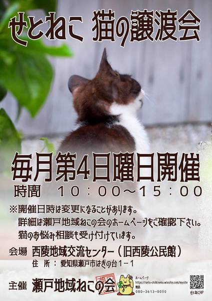 | イベント内容 | 【中止のお知らせ】 新型コロナウィルス拡大防止のため、譲渡会は中止になりました。 次回開催日は4月26日(日)、5月24日(日)に予定しております。 毎月第4日曜日に開催予定ですので、遊びに来てくださいませ★ 3月22日に予定されていた皆様には謹んでお詫び申し上げます。 ↓↓【中止】↓↓ 猫の譲渡会を開催します★ 子猫から大人猫まで、いろんな柄の可愛い子達が参加します。 室内につき、冷暖房完備! 駐車場もあります。 ぜひ遊びに来てくださいね! |