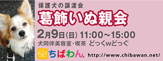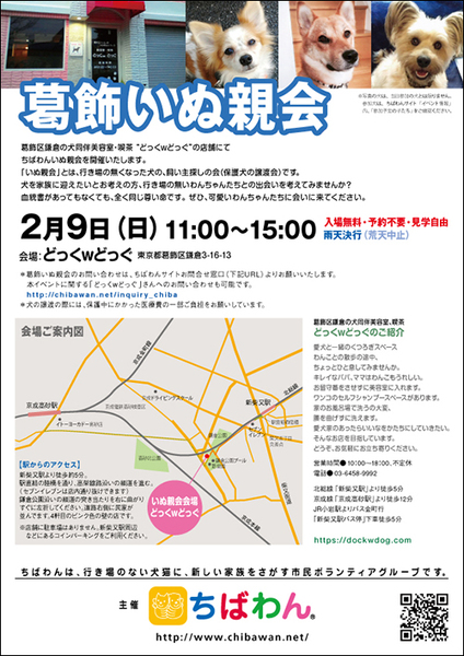 | イベント内容 | 葛飾区鎌倉のいぬ同伴美容室・喫茶“どっくwどっぐ”の店舗にていぬ親会を開催します。 可愛い保護わんこたちが新しい家族との出会いを求めて参加します!! いぬ親会見学は予約等必要ありません。 是非、ご家族同伴でご来場下さい。 開催日:2月9日(日)11:00~15:00 室内開催 雨天決行 場所:どっぐwどっぐ 東京都葛飾区鎌倉3-16-13 《アクセス》 どっくwどっぐ 【駅からのアクセス】 新柴又駅より徒歩約5分。 駅直結の陸橋を通り、高架線路沿いの細道を進みます。 (セブンイレブンは店内通り抜けできます) 鎌倉公園沿いの細道の突き当たりを右に曲がりすぐに左折してください。 道路右側に民家が並んでいます。4軒目のピンク色の壁の店です。 ※店舗に駐車場はありません。 当日お車の方はコインパーキングをご利用ください。 《注意事項》 【当日の流れ】 (1)家族募集中のいぬとお会いになりたい方はどなたでも自由にご参加いただくことができます。ちばわんボランティアは名札をつけておりますので、ご遠慮なくお声をかけて下さい。また、募集中のいぬのそばには預かりボランティアが控えておりますのでいぬの性格や生活習慣など、遠慮なくご質問ください。 (2)ご希望のいぬが決まったら、お申し込みアンケートにご記入の上、ボランティアにお渡し下さい(前日までにメールでアンケートを送信してお申し込みいただくこともできます。) ◆「いぬ」アンケート送信先:http://chibawan.net/contactform_dog (3)アンケート内容を拝見し、お話させていただきます。 (4)原則として一両日中にお返事の連絡をさせていただきます。 (5)ご縁が成立した場合には、後日、こちらからご自宅までいぬをお届けし、約1ヶ月のお試し生活に入っていただきます。お届けの際に、書面での譲渡契約書を交わします。 ※ワクチン・不妊手術代など保護犬にかかった費用は、家族になるいぬ親さんにもご負担をお願いしています 《お知らせ》 会場ではチャリティグッズを販売します 売上金は保護した犬猫の医療費など、 ちばわん活動費として大切に使わせていただきます 《お問い合わせ》 いぬ親会について:http://chibawan.net/inquiry_dog_other ※いぬ親会当日はメールが見られません。また、お問い合わせの際は、必ず「具体的な件名」を入れて多数の迷惑メールと区別がつくようにお願いいたします。 葛飾いぬ親会イベントホームページ http://chibawan.net/event/20200209-katsushika-dog ちばわんホームページ http://chibawan.net/ |